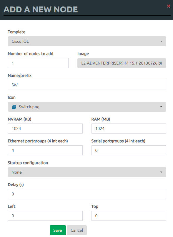 - Cisco IOL Template 에서 원하는 이미지 선택 후 , 이름, Icon, Ethernet portgroups 등 적절하게 설정 한 후 저장.