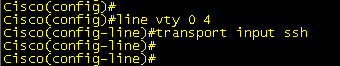기본값으로 transport input all 로 설정이 되어 있으며, SSH 만 접속 가능하도록 위와 같이 설정해 준다.