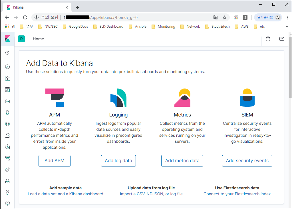 웹브라우저에서 http://elk_server_ip:5601 로 접속하면 아래와 같이 Kibana Web UI 화면이 보이게 됩니다.