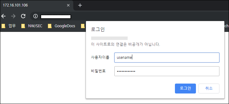 웹 접속 후 아래와 같이 로그인 창이 나오며, AD에 등록된 계정정보 입력 후 로그인 하면 됩니다.