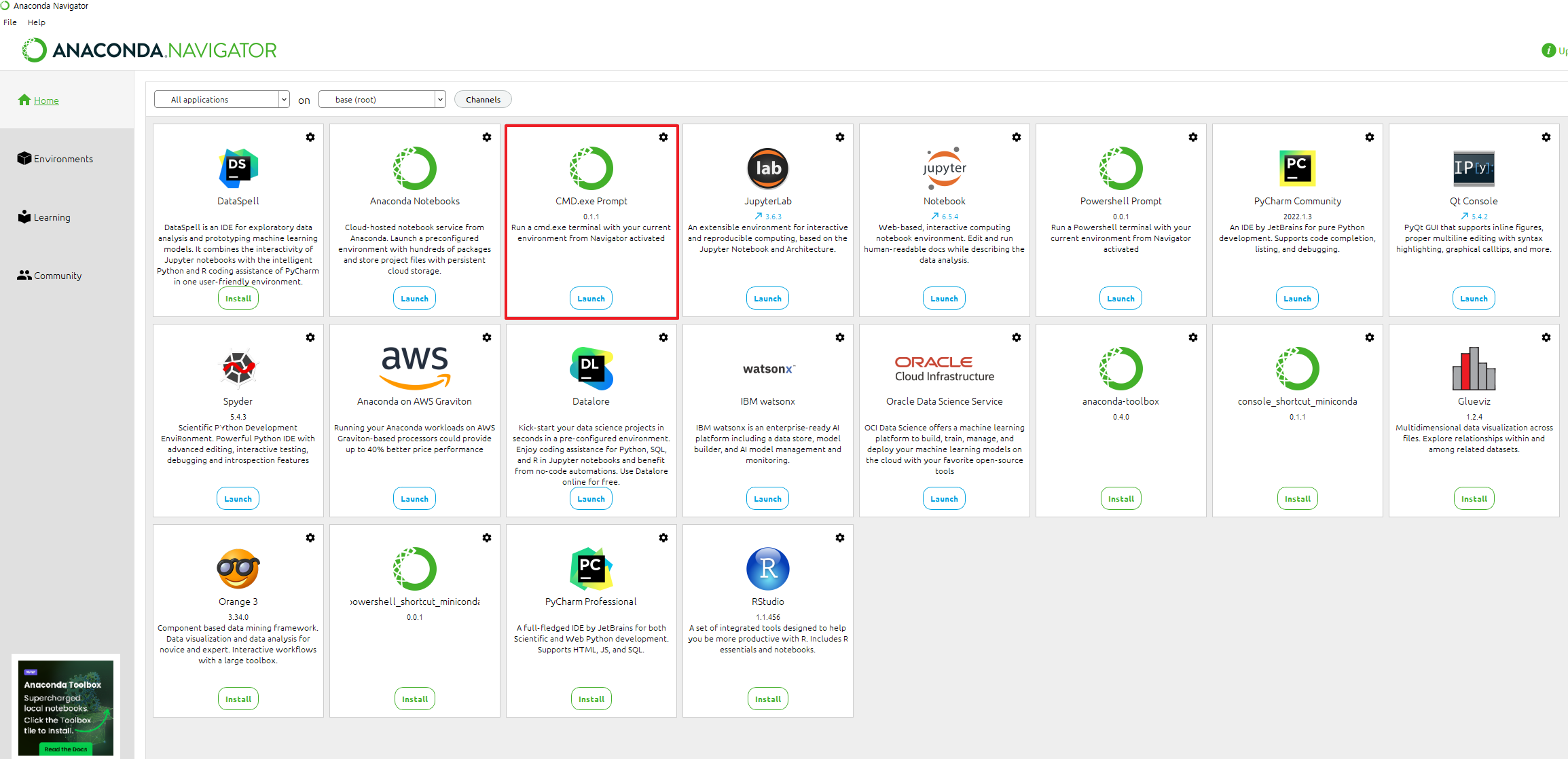 설치가 완료되면 ANACONDA.NAVIGATOR 가 실행이 되며 여러가지 애플리케이션을 지원하는데