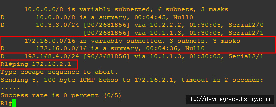 라우팅 테이블 정보를 보면 172.16.0.0/16으로 summary 된 정보가 확인이 되며 interface는 null로 Drop 된다.